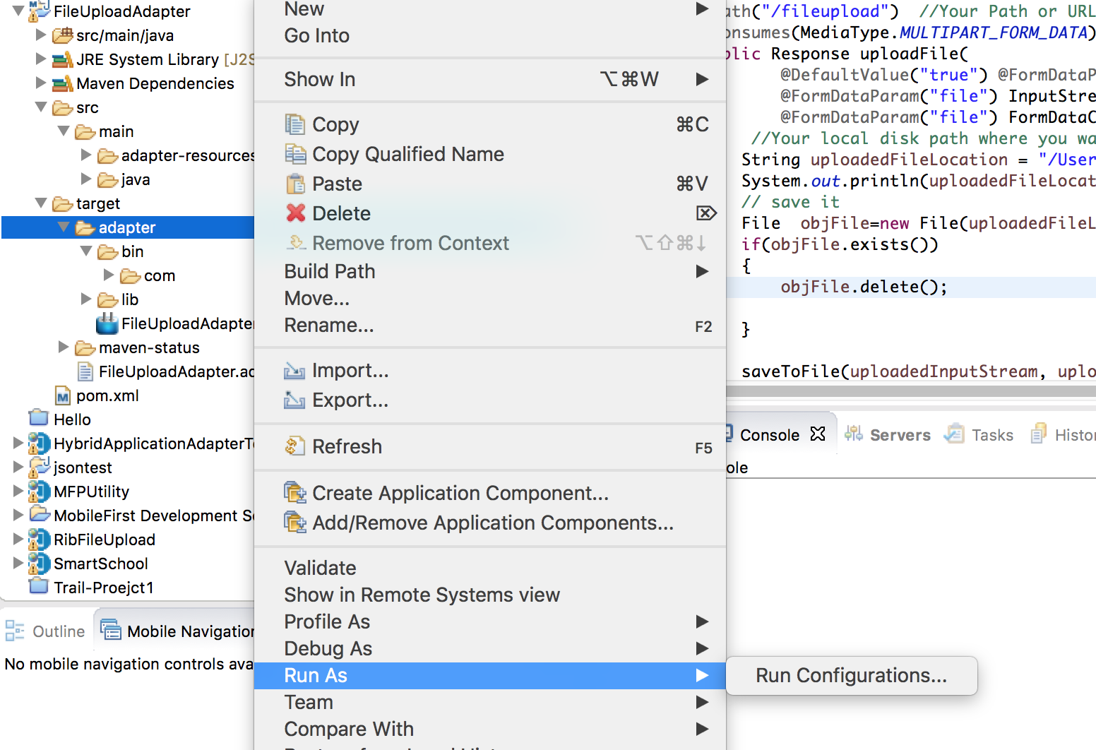 2)完成此操作后,需要右键单击maven项目--即FileUploadAdapter以执行-> Maven部署时的运行。根据屏幕截图,您正试图在maven项目的“目标”文件夹上执行运行。这不会给你任何选择。