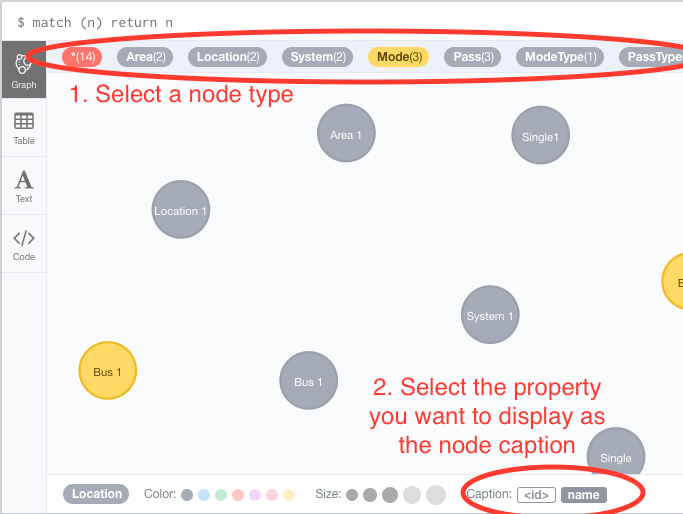在顶部的标签栏中单击要影响的节点标签类型。窗口底部将出现一个条形,允许您选择颜色、大小和标题,以格式化您在UI中看到的节点。