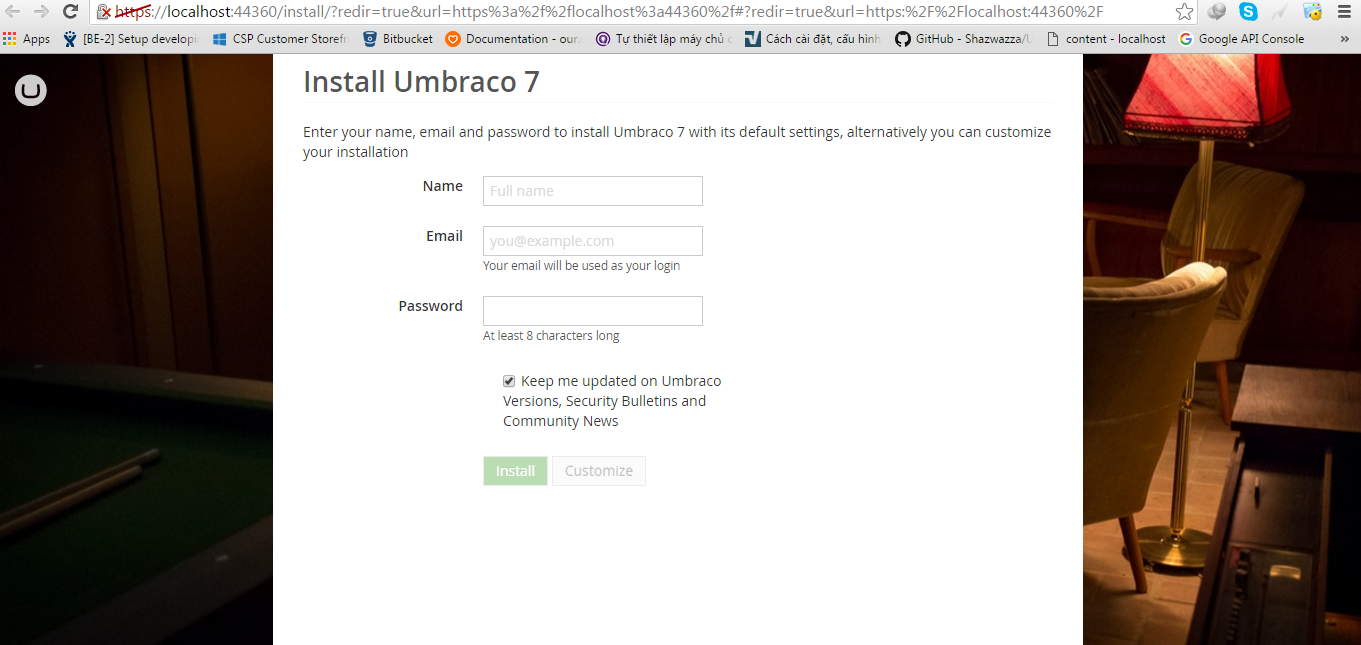 在Visual中打开应用程序时,我尝试通过Nuget安装Umbraco。安装Umbraco后,我在Chrome浏览器中运行应用程序: