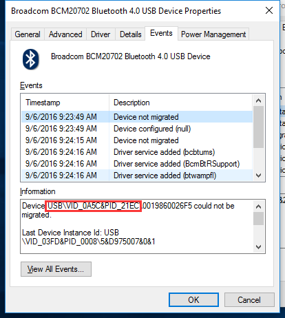首先,您需要知道您的dongle的VID和PID,一种方法是将它插入到您的PC上,并在设备管理器中查看,