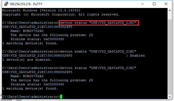 您可以使用"devcon“命令查询/更改设备的状态。