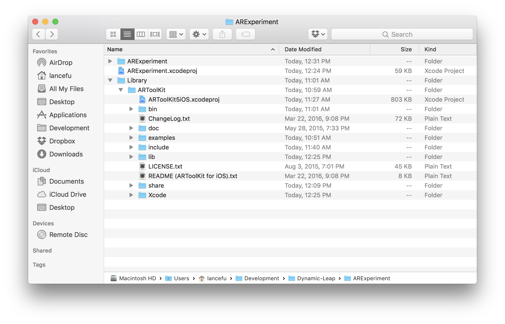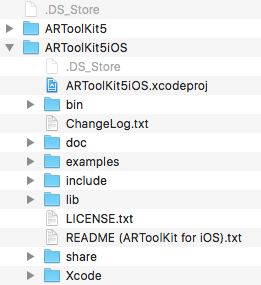 我已经下载了ARToolKit SDK,并看到了以下内容。ARToolKit5目录是用于Mac的,所以我已经关闭了这个目录。ARToolKit5iOS是我试图导入到Xcode项目中的目录。