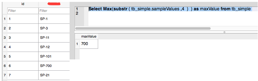 Select Max(substr ( tb_simple.sampleValues ,4 ) ) as maxValue from tb_simple