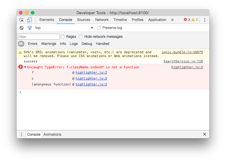 我正在用ionic构建一个应用程序,在控制台中,我在chrome中的highlighter.js中得到了下面的错误