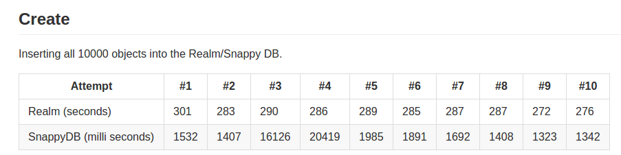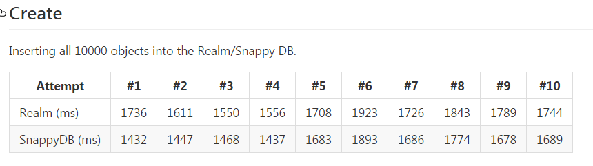 我正在尝试将领域与Snappydb (希望查看基准测试的人的这是我的回购)进行比较。我想我的方法是错误的,因为与Sanppydb相比,存储到数据库的时间在领域中花费了非常长的时间。