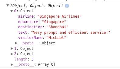 {“VISITORNAME”:“迈克尔”,“起飞”:“新加坡”,“目的地”:“上海”,“航空公司”:“新加坡航空公司”,“文本”:“非常迅速和高效的服务!”},{"VISITORNAME":"AMY",“起飞”:“新加坡”,“目的地”:“约翰内斯堡”,“航空公司”:“卡塔尔航空公司”,“文本”:“我通过SALMA,世卫组织非常乐于助人和礼貌。尽管我在两天的时间里忙于会议,我们还是设法通过电子邮件迅速地进行沟通。有一次,我们开始敲定她通过电话联系我的交易“},{"VISITORNAME":"ANTHONY",”起飞“:”新加坡“,”目的地“:”汉城“,”航空公司“:”新加坡航空“,”短信“:”这是我第一次与SKYLUX公司打交道,我经常出差。耐莉在电子邮件上的转变是非常迅速和有帮助的。总的服务是10/10。“}