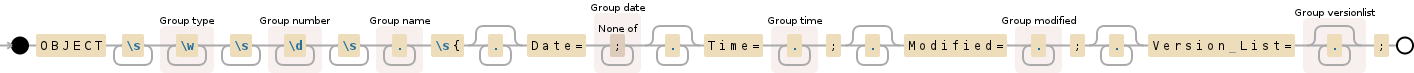 OBJECT\s+(?<type>\w+)\s+(?<number>\d+)\s+(?<name>.+?)\s{.*?Date=(?<date>[^;]+).*?Time=(?<time>.+?);.*?Modified=(?<modified>.+?);.*?Version List=(?<versionlist>.*?);