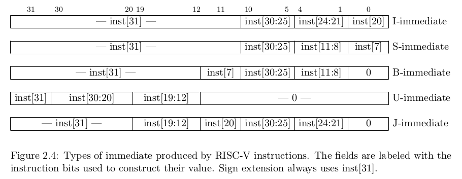 因此,指令编码中的直接位的“洗牌”是使每个输出立即位具有尽可能少的输入指令位选项。例如,直接位1只能来自指令位8(S-立即或B-即时)、21 (I-立即或J-立即)或常数0(U-立即指令或R-类型指令,没有立即)。即时位0可以来自指令位7(S-立即)、20 (I-立即)或常数0.直接位5只能来自指令位25或常数零。诸若此类。