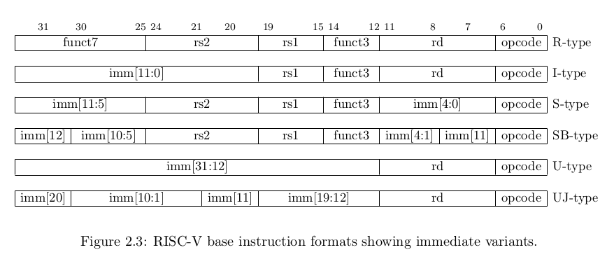有四种类型的指令格式R、I、S和U,然后是S和U类型的变体,它们是SB和UJ,我认为它们的意思是分支和跳跃,如图2.3所示。然后是由RISC-V指令直接生成的类型,如图2.4所示。