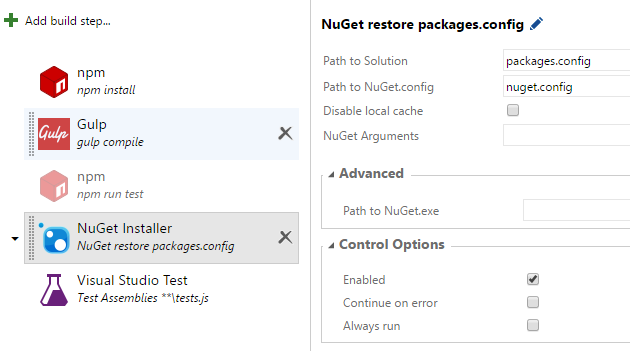 但是,当我将Nuget构建步骤添加到我的TFS2015构建定义中时,包将恢复到../Nuget/ packages,它位于根文件夹之外。在接下来的构建步骤中,我在引用还原的nuget包时有问题。