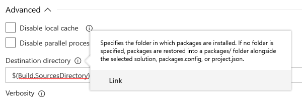 根据高级选项中的“目的目录”中的注释,如果您没有指定一个文件夹,它将为您选择一个可能不是您想要的文件夹,所以只需将$(Build.SourcesDirectory)放在那里即可。