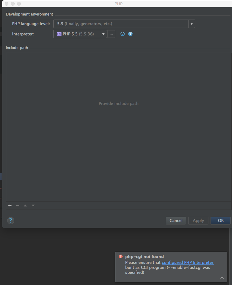 brew,请键入brew install php56If you need to have this software first in your PATH run:。在此下面,您将看到列出的两条路径。一个以bin结尾,另一个以sbin结尾。你想要以bin结尾的那个。CLI Interpreter框的末尾,单击...以打开选项。+以添加新的解释器。PHP executable字段中,输入以下/usr/local/Cellar/php@5.6/5.6.36_1/bin/php-cgi (同样,这是基于您将在终端窗口中找到的路径--在上面的第三步中描述)php.ini文件所在的位置。你的任务完成了。这对我来说适用于三种不同的装置。