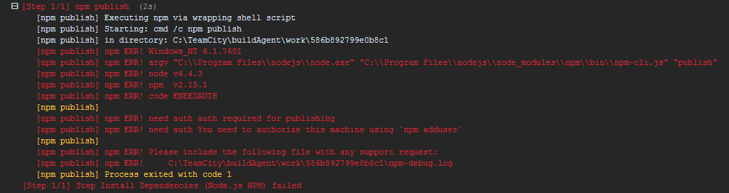 我正在尝试使用Team来运行测试,并将NPM包发布到本地sinopia存储库。我已经在服务器上安装了sinopia存储库,并且我可以使用本地计算机上的npm publish命令成功地将npm包发布到该存储库。