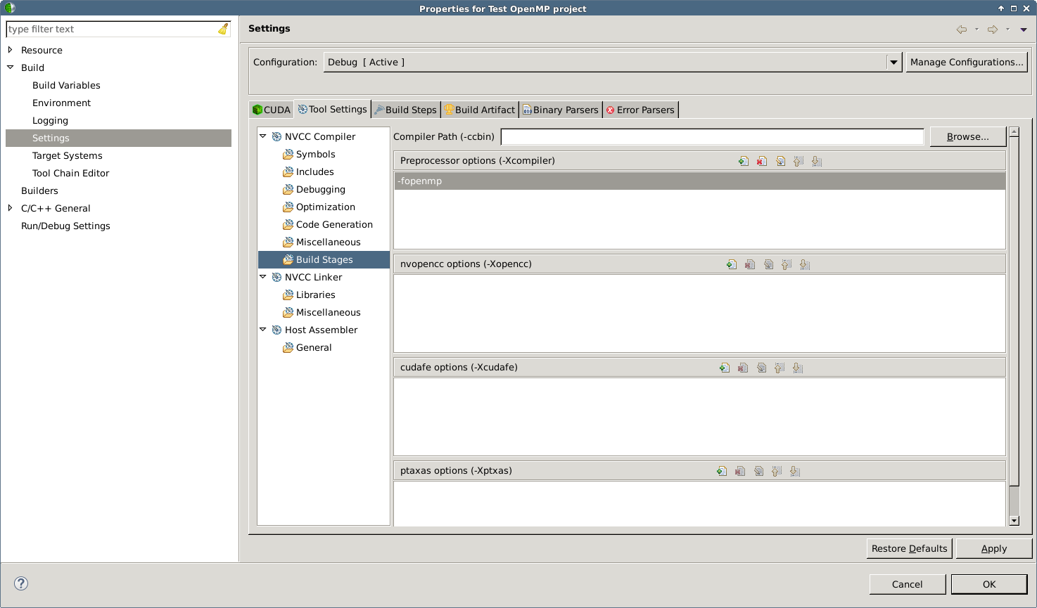 我尝试添加-fopenmp和-Xcompile作为nvcc选项,但我得到“无法打开选项文件.”错误。我想我错过了一些基本的东西,但是我发现的任何信息都是非常特定的,或者是过时的。