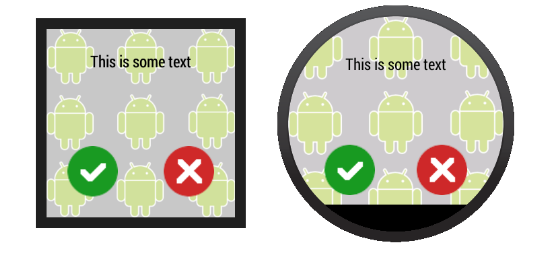 可穿戴UI库中包含的BoxInsetLayout类扩展了FrameLayout,并允许您定义一个用于方形和圆形屏幕的布局。这个类根据屏幕形状应用所需的窗口嵌入,并允许您轻松地对齐屏幕中心或边缘附近的视图。