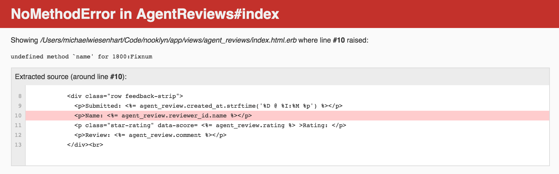 agent_review.reviewer_id返回一个整数(Fixnum),您不能在Fixnum对象上调用name方法。