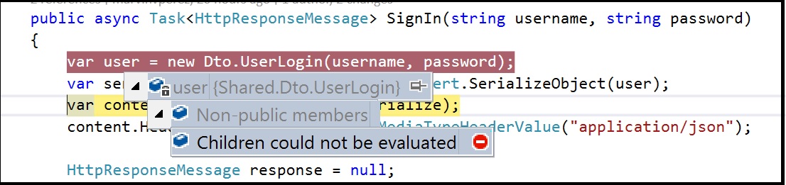 }上面的代码不抛出错误,可以实例化"user“变量。但是,问题是,当序列化行发生时,它不会序列化任何内容。“用户”对象似乎无法访问或显示“电子邮件”和“密码”这两个属性。但是我可以使用"user.Email“在调试中访问它们。我附了一张截图。