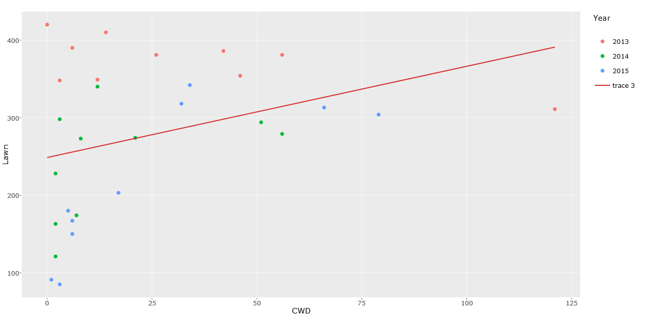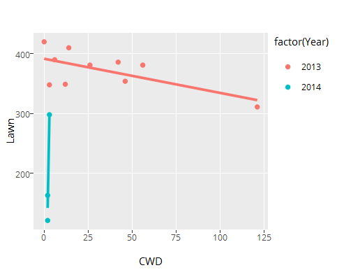 lawn <- ggplot(dat, aes(x=CWD, y=Lawn, colour=factor(Year))) +
