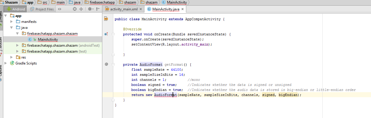 当我将光标悬停在“on错误”时,它的意思是"AudioFormat在android.media.AudioFormat中不是公共的,不能从外部包访问“。我怎么才能修好它?我所遵循的链接中的代码是否错误?我一直在为Android搜索教程代码,以开发类似Shazam的应用程序。