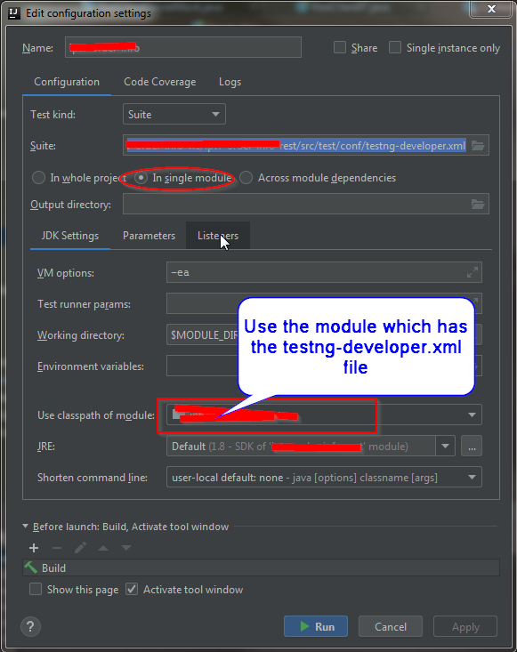 我通过在TestNG "Run/Debug Configurations“中的Configuration选项卡下选择"In整项目”(我在单个模块中选择了"In single模块“)来工作。 然而,以前的配置在IntelliJ IDEA 15中有效,因此在我看来,它可能来自于与新的IDE的急剧变化。