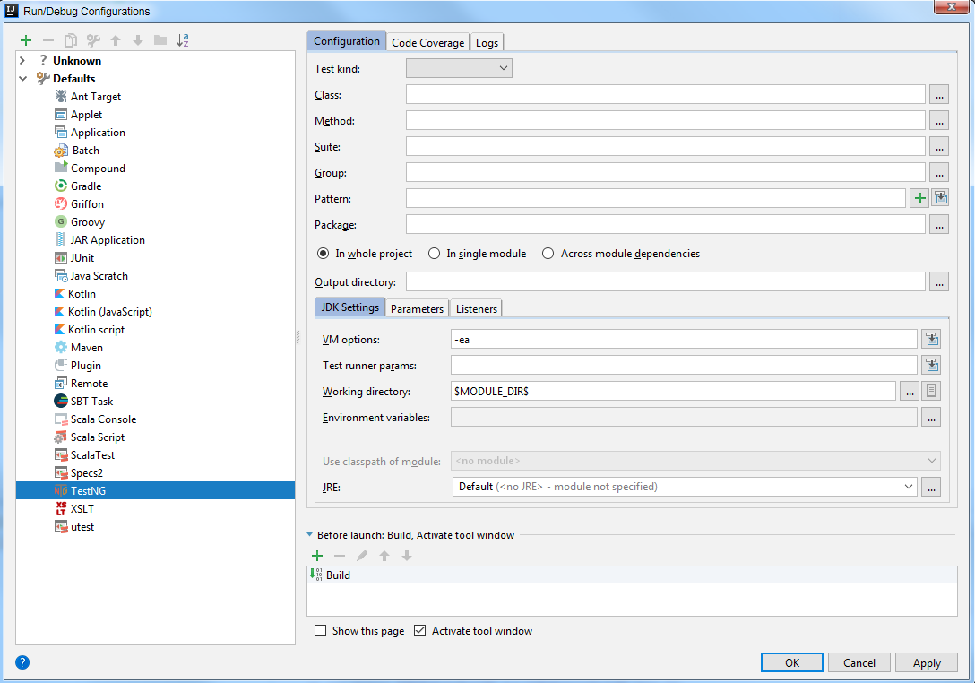 我在这里找到了一个解决方案:https://intellij-support.jetbrains.com/hc/en-us/community/posts/206597869-Cannot-launch-NGTest-runner-in-IntelliJ-IDEA-2016-1