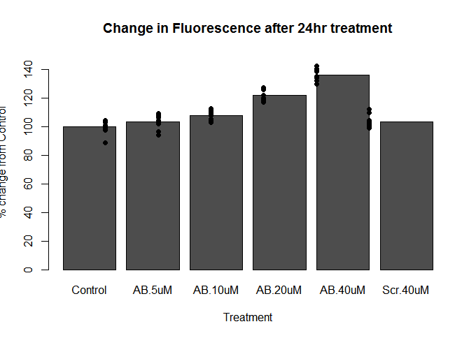 我有一个使用stripchart的散点图覆盖的桶形图。