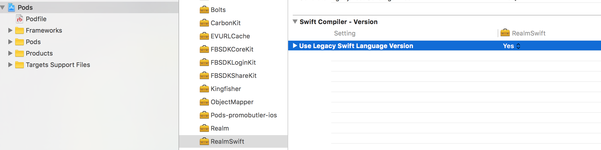 end在2.4.0版本中,SWIFT2.x不再受支持。领域2.3.0是支持SWIFT2.3的最后一个稳定版本。同样,正如Sound休克所说,确保你有“用户遗产,斯威夫特语言版本”到“是”的RealmSwift Pod。希望这能有所帮助。