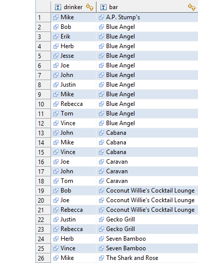 having count(*) = (select count(distinct drinker) from frequents);这个查询只是计算每个酒吧的饮酒者人数。如果计数与饮酒者总数相匹配,则"bar“通过并在结果集中。