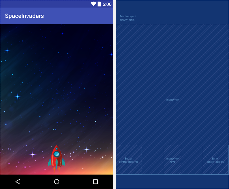 正如你所看到的,在RelativeLayout的底部你可以找到一艘宇宙飞船和两个按钮(一个在左边,另一个在右边)。按钮是看不见的。左边的按钮有"control_izquierda“作为id,右边的按钮是"control_derecha”。