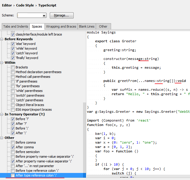 嗯..。我在PhpStorm 2016.2.1中清楚地看到了这一点(删除屏幕截图中箭头指向的这两个空格的选项)。我自己也不是TypeScript的人。所以也许它不会影响你的代码。但对我来说,这似乎是正确的选择。