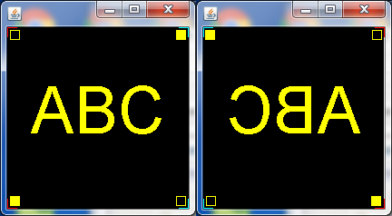 人们会期望这个图像会被完美的镜像。对于所有笔画和空心形状(= drawXxx()方法)都是如此。然而,所有填充的形状(= fillXxx()方法)都是在我期望它们的左侧绘制的,例如填充的黄色矩形,您还可以注意到黑色背景已经移动,就像右边边框的白线所看到的那样。