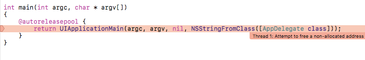 frame #39: 0x3636aaae libdyld.dylib`start + 2我已经启用了NSZombies,而且没有新的信息。我还试过打开地址消毒剂,它也会偶尔崩溃,但通常也会在主要方法上崩溃: