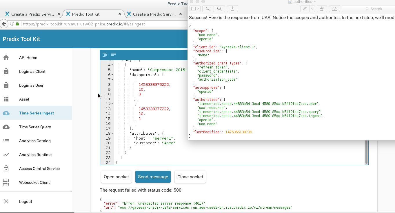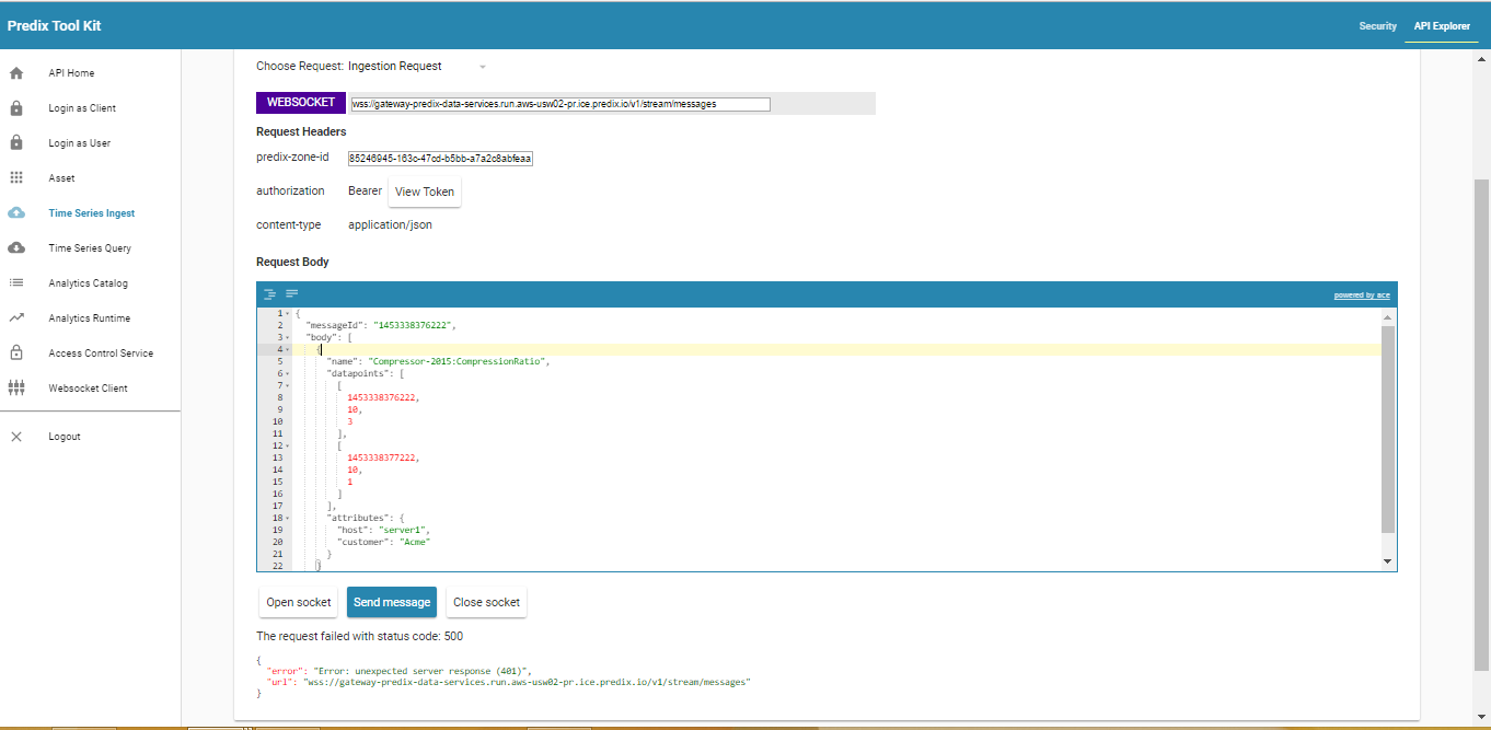 嗨,我试图在timeseries中保存数据,但是当我在websocket中输入wss://gateway-predix-data-services.run.aws-usw02-pr.ice.predix.io/v1/stream/messages时,我在timeseries上遇到了一个错误,当我单击打开的套接字时,它显示了一个错误。