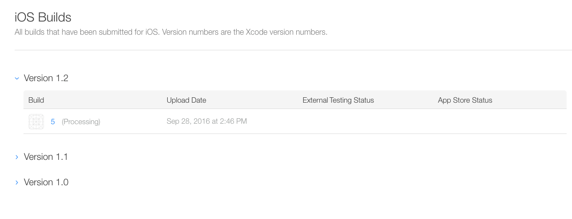 当我的构建上传时,它显示在iTunes连接中,但是当上传成功完成后,构建不再显示在iTunes连接上,它就从那里消失了。
