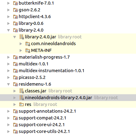 当我检查外部库时,我发现库-2.4.0和regdeMenu-1.6都包含com.nineoldandroids: