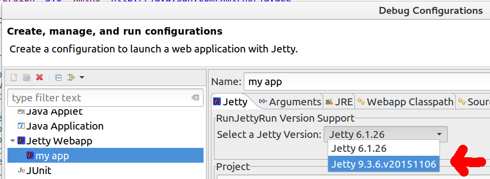 RunRun Configurations...Jetty Webapp项。Jetty选项卡中,选择所需的Jetty,如下所示: