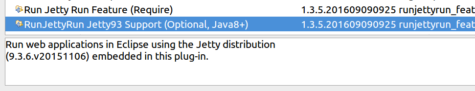 我使用夜间站点http://xzer.github.io/run-jetty-run-updatesite/nightly/安装了RunJettyRun,并确保还安装了RunJettyRun Jetty93支持: