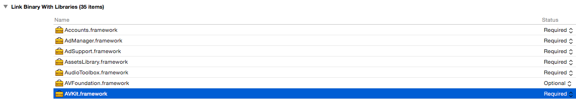 Reason: image not found那么,似乎还没有添加AVKit.framework。哦,但它确实是。