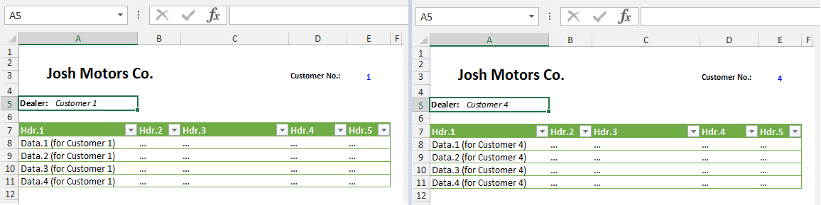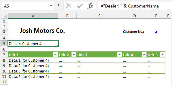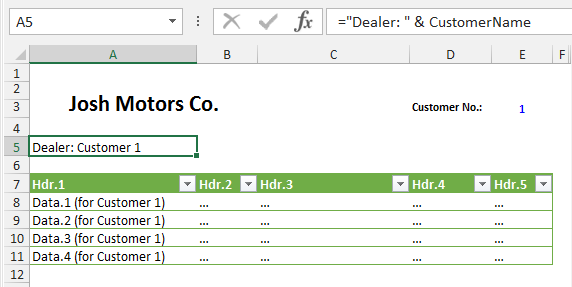 要实现此解决方案,我们需要重新创建所需的输出范围,并在Shape中添加一个A5,其中包含指向输出范围的链接。假设我们不希望在报告所在的同一个工作表中看到这个输出范围,并且请记住输出范围单元格不能隐藏;让我们在B2:C3上另一个名为“Customers Data”的工作表中创建这个输出范围(参见图3)。输入B2 Dealer:,在C2中输入公式=Customer Name,然后根据需要格式化每个单元格(B2字体粗体,如果您愿意,C3可以有不同的字体类型--让我们为这个示例应用字体斜体)。确保范围具有适当的宽度,这样文本就不会溢出单元格。