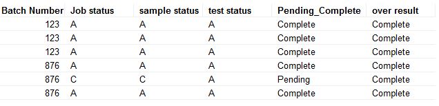 @JQA --当我理解你的问题时,我认为你是在试图显示每批号“Pending_Complete”列中最重复的状态。如果是这样的话,下面的过度表达式应该会得到结果。