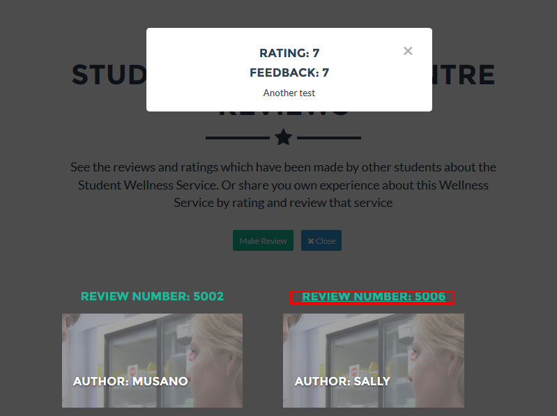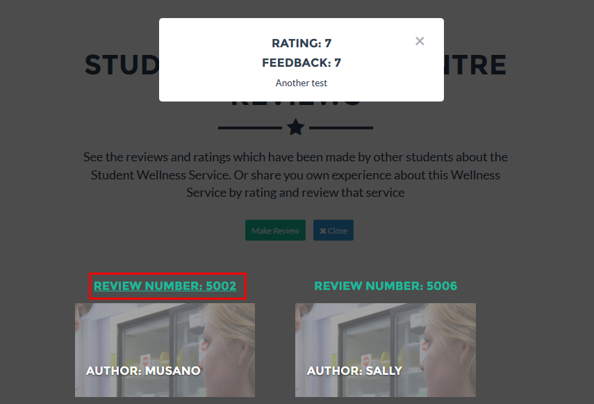 当您单击Review :5002(这是表中的ReviewID (ID:5002) )时,会产生一个弹出,显示ReviewID的评级和反馈。