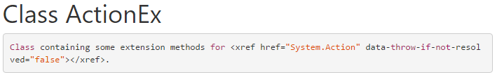 summary: "\n Class containing some extension methods for <xref href=\"System.Action\" data-throw-if-not-resolved=\"false\"></xref>.\n"最后的HTML输出包含相同的字符串: