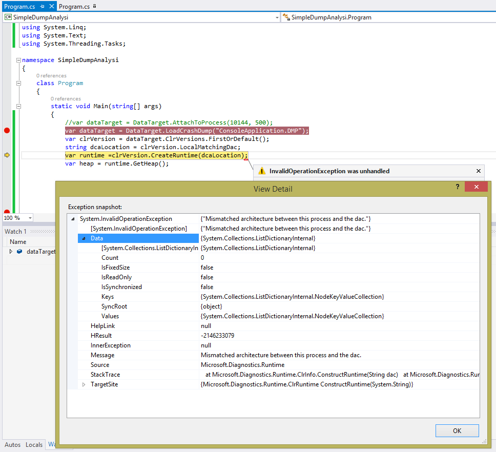 我正在处理CLRMD库,并试图加载一个转储。在这个过程和dac之间,我得到了不匹配的架构。控制台应用程序,它是创建字符串数组的x86应用程序。