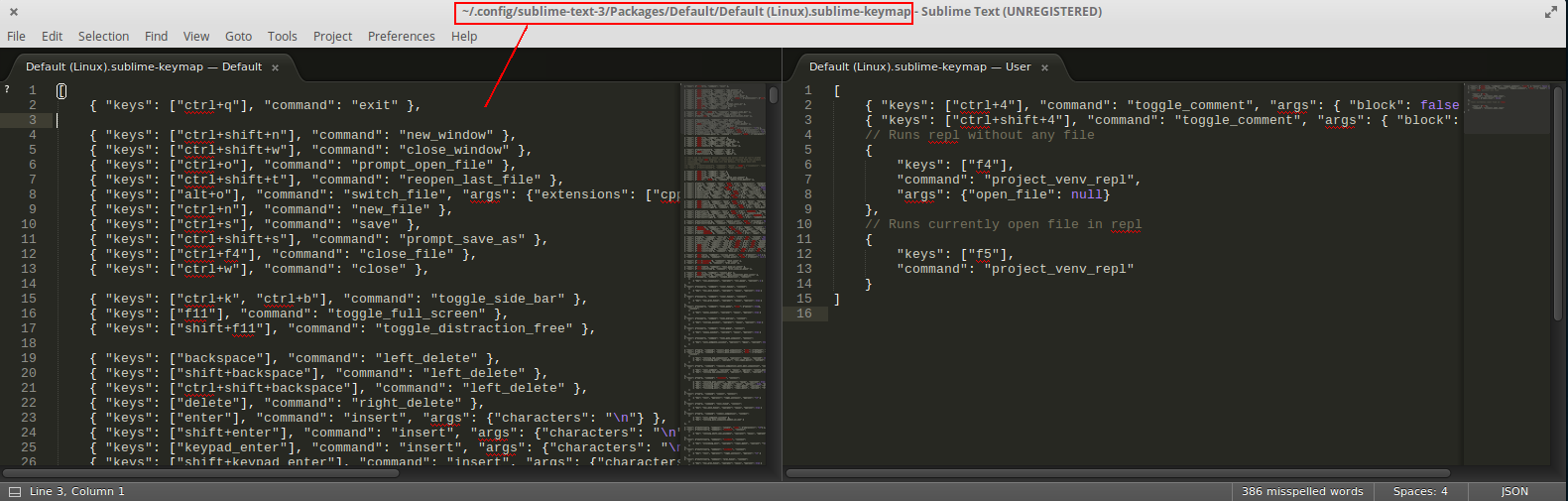 Unable to open /home/gabriel/.config/sublime-text-3/Packages/Default/Preferences.sublime-settings不仅ST的安装目录中缺少此文件,还缺少整个~/.config/sublime-text-3/Packages/Default/文件夹。但是,如果我打开Preferences/Key Bindings,默认的密钥映射文件将正确打开: