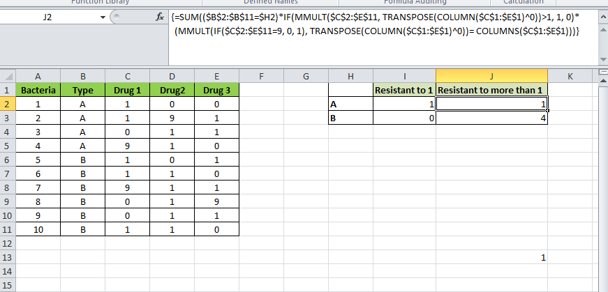 第一个MMULT用于测试任何细菌的行总数是否大于1;第二个MMULT用于查看是否所有细菌的行条目都是<> 9。