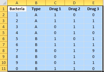 1)在表的右侧创建一个额外的列(名为" count "),每一行细菌数为1s。公式是:=COUNTIF(C2:E5, "1")