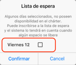 message: "Algunos días seleccionados, no poseen disponibilidad en el chárter. Puede inscribirse a la lista de espera y el sistema lo tendrá en cuenta cuando algún espacio se libere\n\n\n",