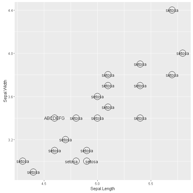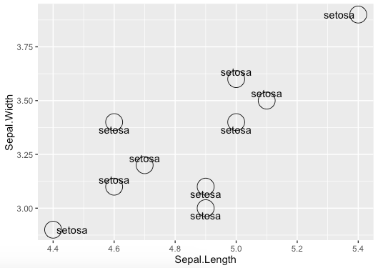 g <- ggplot(iris2[1:20,], aes(Sepal.Length, Sepal.Width)) + geom_point(pch=1, size=8)