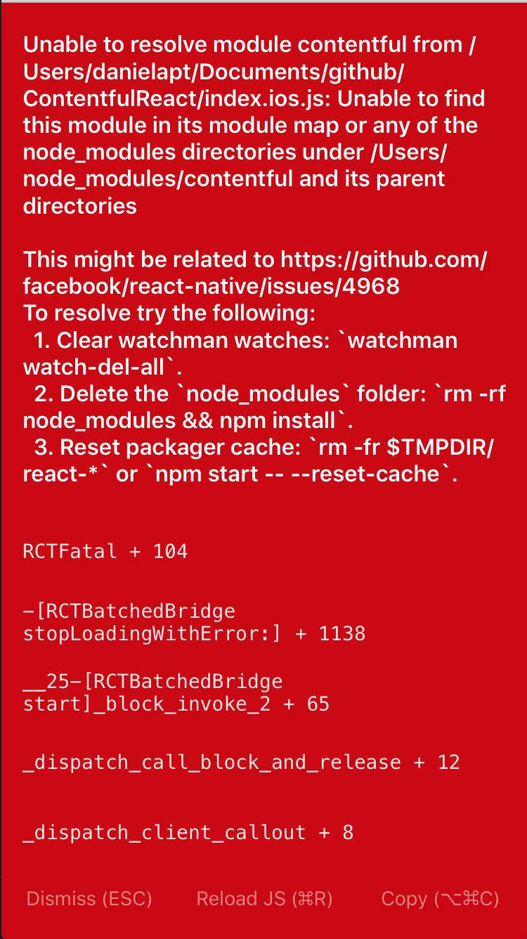 我正在维护内容丰富的sdk。我已经建立了一个简单的示例,展示了如何在React中使用SDK,您可以检查它这里 --基本上是从我们的示例空间中获取项目列表,并在ListView.Check indes.ios.js中显示名称。您的机器中的缓存似乎有问题。无论如何,我希望这个helps.If您有更多的问题,请随意在我们的github 页面中创建问题。