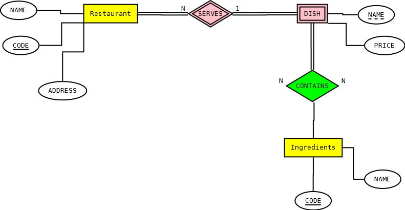 Restaurant不是一个弱实体,因为可以单独存在。同样的规则也适用于成分。配料不需要放在任何一道菜里,但没有任何配料就不可能存在。如果没有相应的餐厅提供这道菜,就不可能有菜。假设菜单上有不属于任何餐馆的菜肴。在你的模型中它的目的是什么?